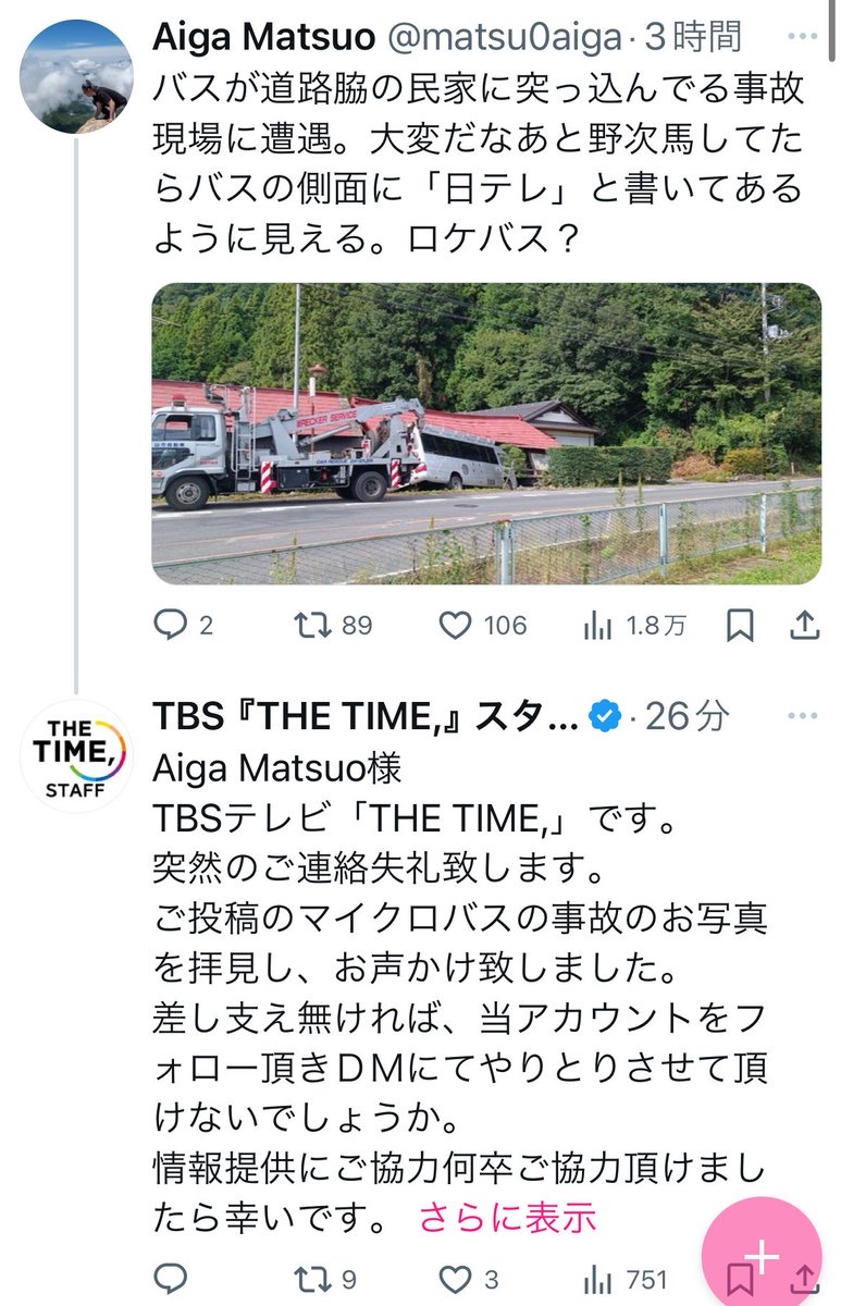 【悲報】テレビ局さん、「ロケバス」ごと民家に突撃取材してしまうwwwww 2024年10月08日 カテゴリ:画像なんJ・VIP 当ページはアフィリエイト広告を利用しています 1: 2024/10/07(月) 19:19:54.28【速報】「日テレ」と書かれたマイクロバスが民家に突っ込む事故 運転操作誤る 茨城・城里町https://www.fnn.jp/articles/-/768838#google_vignette 続きは下スクロール 🔥大バズリ中🔥 続きは下スクロール 👑あなたのおすすめ記事👑 続きは下スクロール この記事の続き 【【悲報】テレビ局さん、「ロケバス」ごと民家に突撃取材してしまうwwwww】の続きを読む 🏆人気記事🏆 「画像」カテゴリの最新記事 「なんJ・VIP」カテゴリの最新記事 🔥大バズリ中🔥 コメント コメントする コメントフォーム 名前 コメント 記事の評価 リセット リセット 顔 星 情報を記憶 コメントを投稿する  AV女優のメイクしてたけど聞きたい事あれば答える【動画】美人のデカお姉さん、バランス感覚がすごすぎるwwwwwww