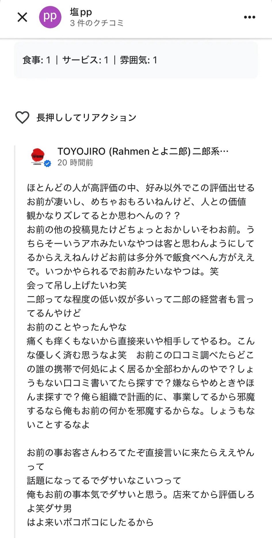 【悲報】ラーメン店、低評価をした客に「懸賞金」をかけて晒してしまうwwww 2025年02月19日 カテゴリ:なんJ・VIP 当ページはアフィリエイト広告を利用しています 1: 2025/02/19(水) 19:44:22.385 続きは下スクロール 🔥大バズリ中🔥 続きは下スクロール 👑あなたのおすすめ記事👑 続きは下スクロール この記事の続き 【【悲報】ラーメン店、低評価をした客に「懸賞金」をかけて晒してしまうwwww】の続きを読む 🏆人気記事🏆 「なんJ・VIP」カテゴリの最新記事 🔥大バズリ中🔥 コメント コメントする コメントフォーム 名前 コメント 記事の評価 リセット リセット 顔 星 情報を記憶 コメントを投稿する  【新6期生】大越ひなのさん(20)、元ド地下アイドル疑惑浮上【文春】〈フジテレビ&中居正広問題〉フジ編成幹部A氏が語った“中居とX子さんの関係"「付き合えばいいのになぁと思っていた」